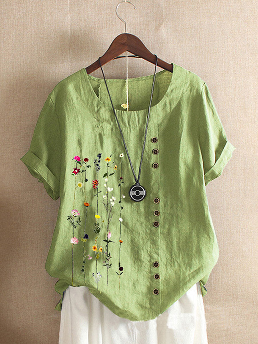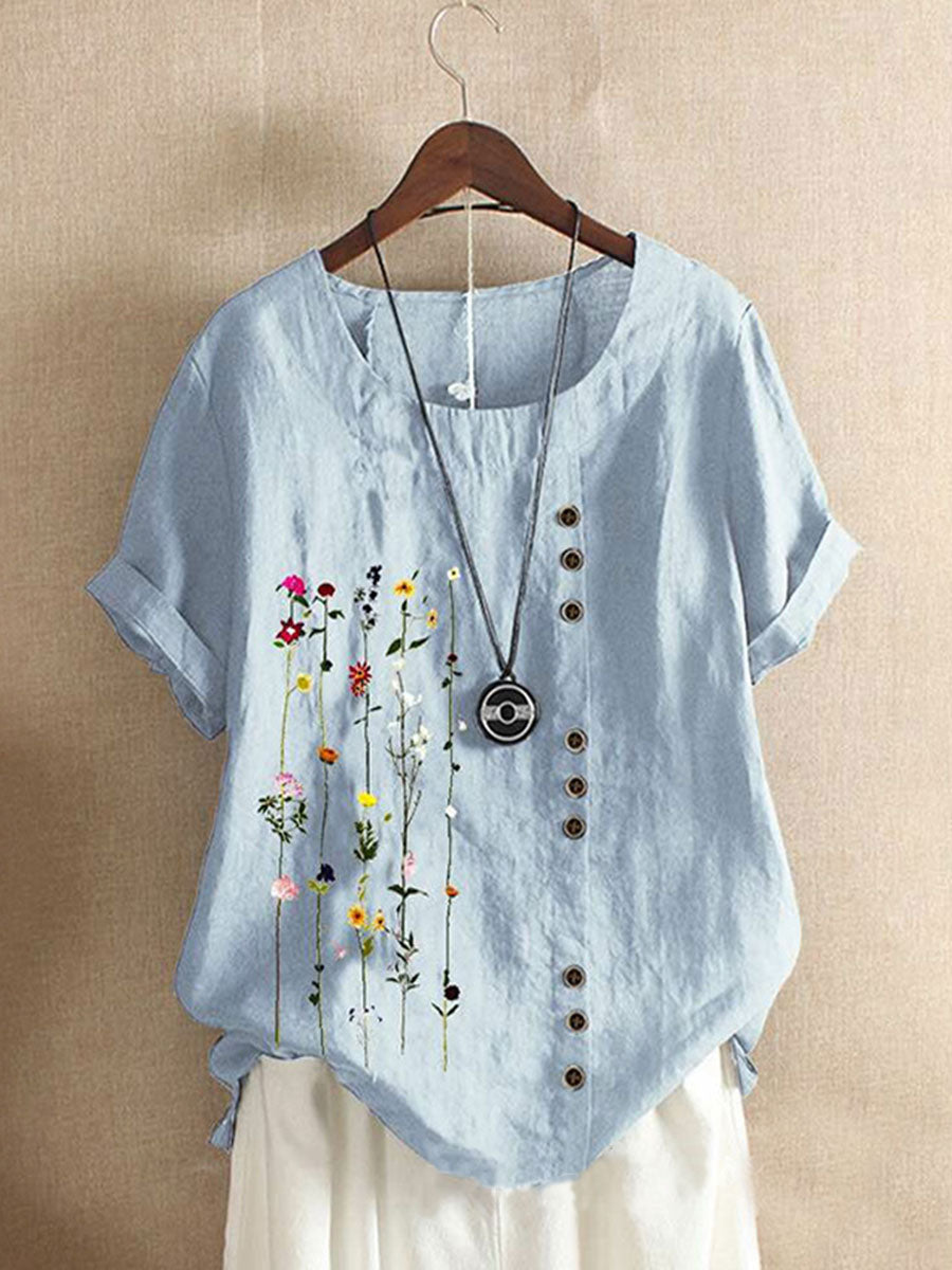 Casual loose cotton and linen printed short-sleeved T-shirt