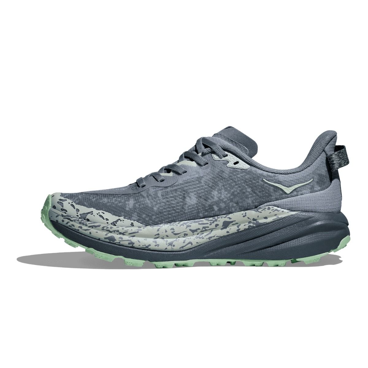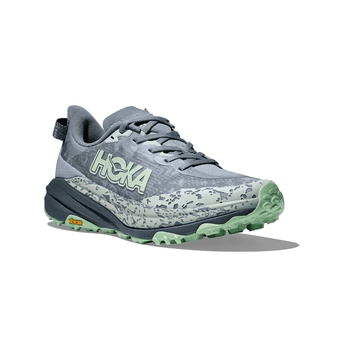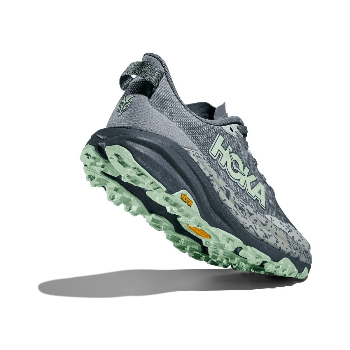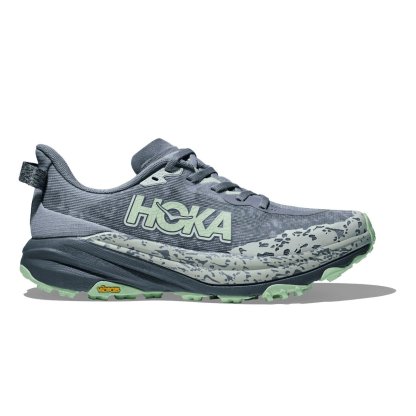 O Hoka Speedgoat 6 apresenta um solado Vibram Megagrip atualizado com sulcos profundos para melhor tração em superfícies secas e molhadas. O tênis foi projetado para proporcionar uma experiência de corrida estável e segura, mesmo nas trilhas mais técnicas.